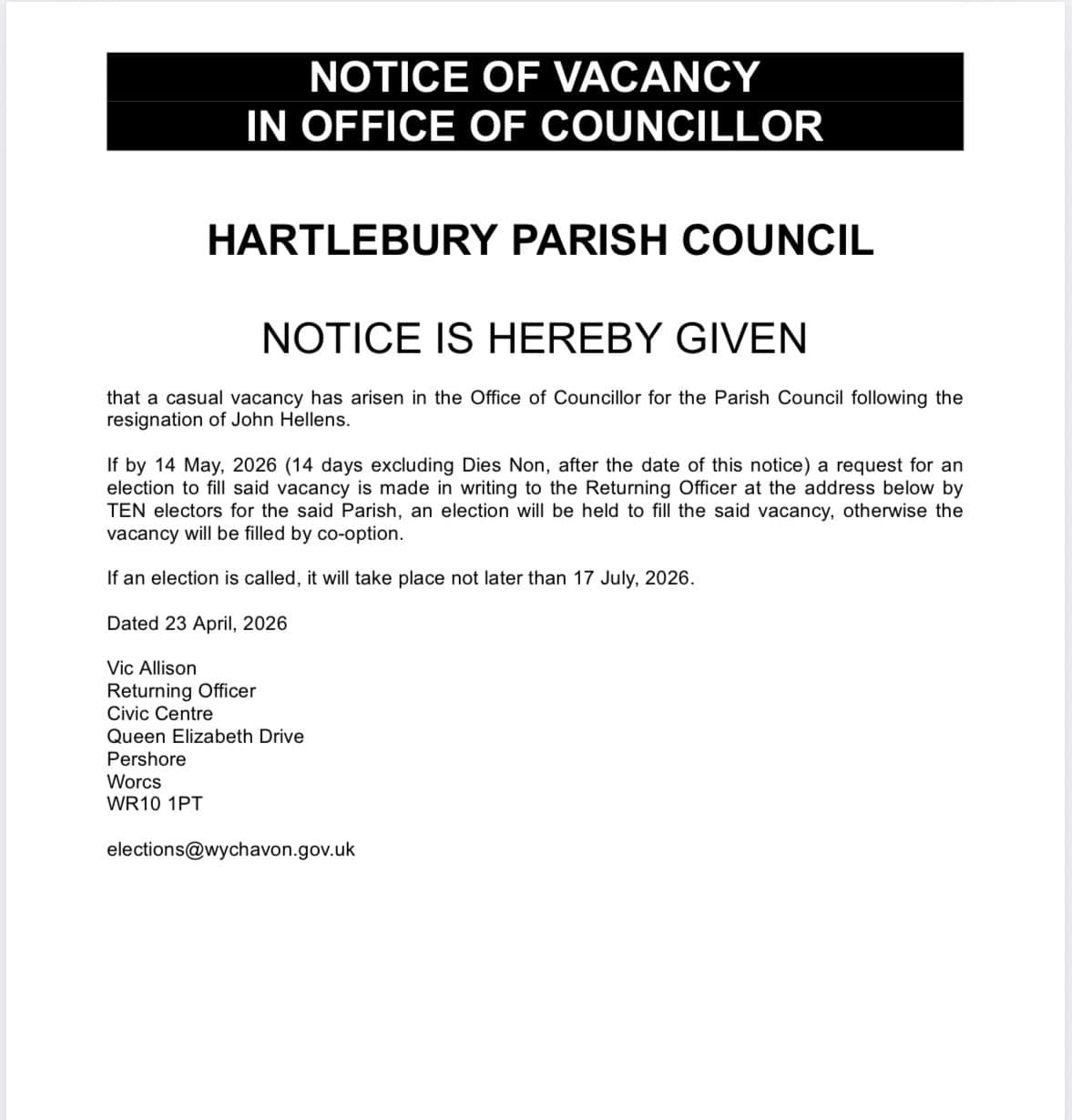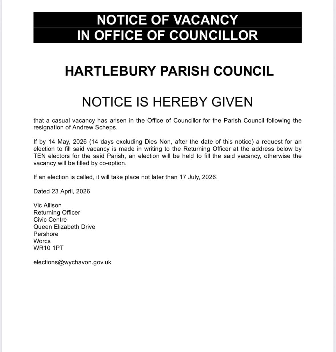 will be held in Hartlebury Parish Hall on April 29th, 2026, starting at 6.00pm.